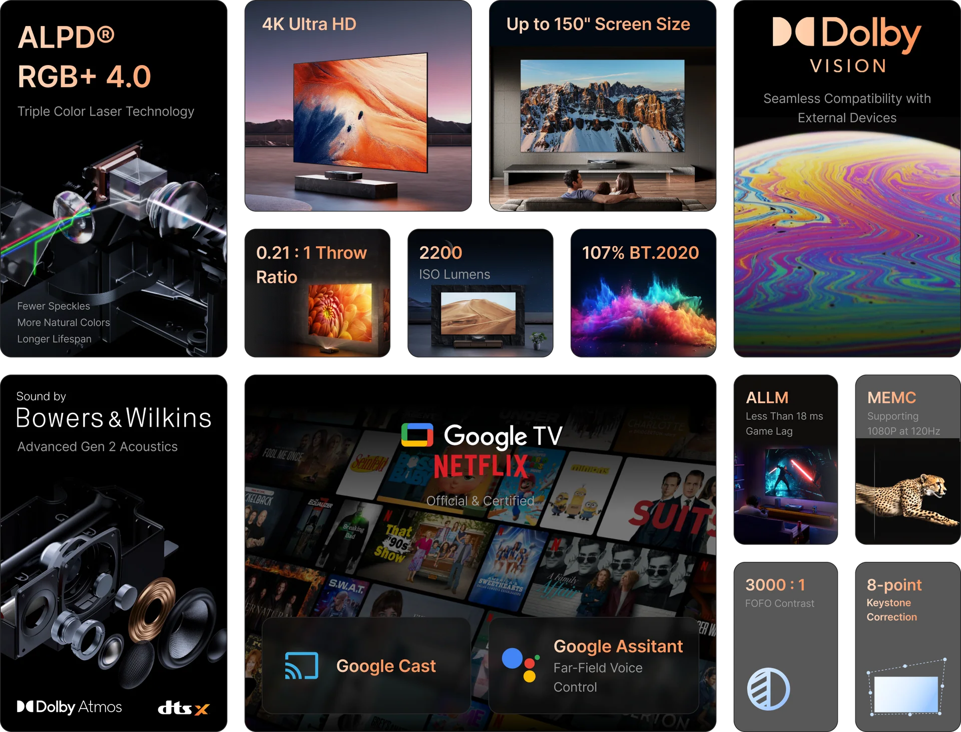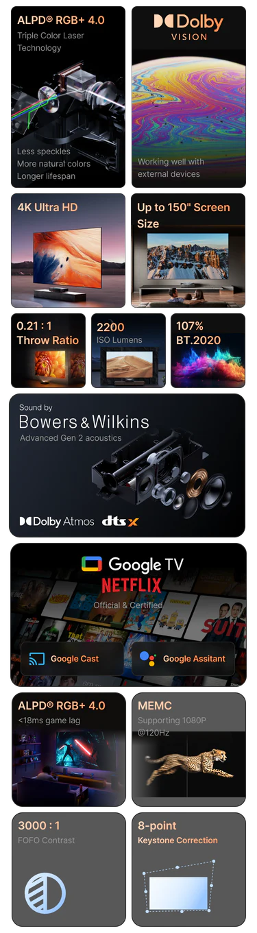 Engineered by Appotronics, ALPD® RGB+ 4.0 triple-color laser technology delivers extraordinary performance that outshines standard RGB laser projectors. Experience vibrant, true-to-life colors that elevate every scene with stunning natural precision. With impressive light efficiency, this technology boasts a laser lifespan of up to 30,000 hours, ensuring consistent brightness without the hassle of frequent replacements. Plus, advanced speckle suppression effectively eliminates distracting artifacts, resulting in a smoother, clearer image for a truly riveting viewing experience.
